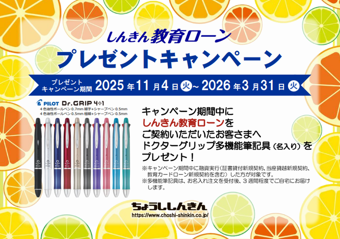 2025年11月4日(火)から2026年3月31日(火)までの間にしんきん教育ローンをご成約いただいたお客さまへ ドクターグリップ多機能筆記具(名入り)をプレゼント!