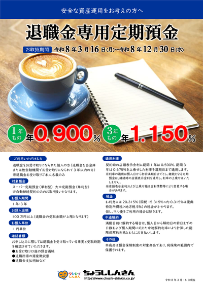 当金庫では、下記のとおり2026年3月16日(月)より退職金専用定期預金の利率を改定し、およびご利用いただける方につきまして退職金受取後の経過年数を変更することといたしましたので、お知らせいたします。