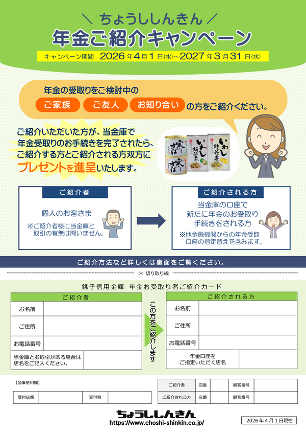 - ご紹介される方:キャンペーン期間中に、ご紹介により当金庫で新たに公的年金の受取手続きをされた個人のお客さま